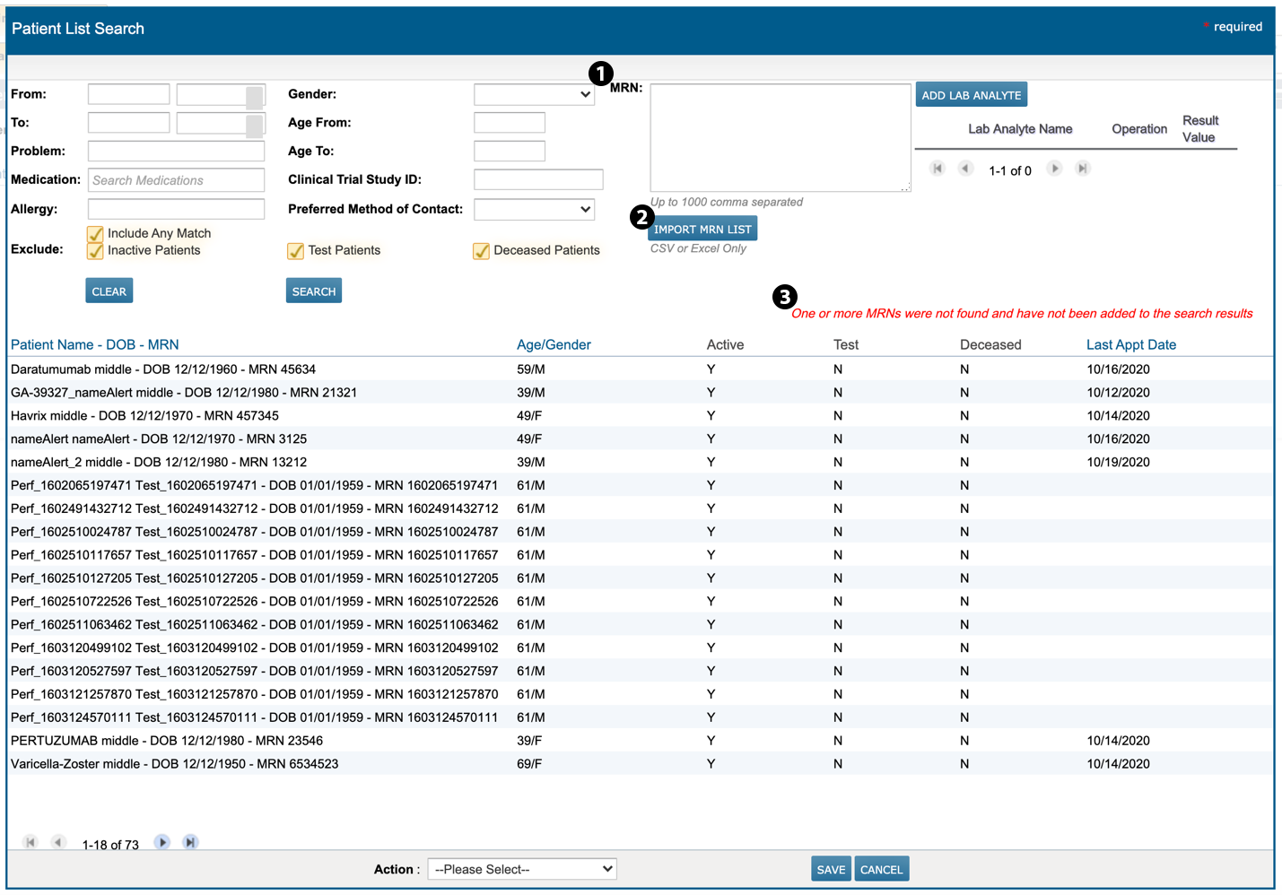 If any MRN in your list is not found, a message will display stating that those MRNs were not included in the search results (see callout 3)