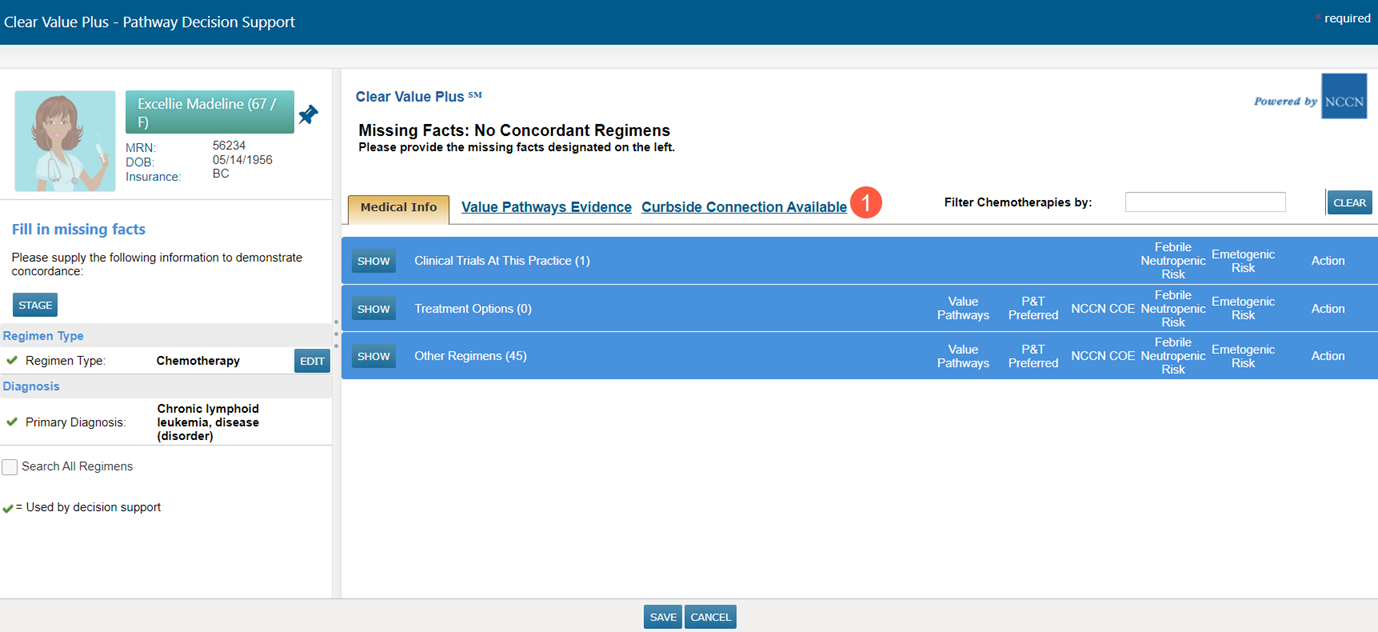 Now, we’ve integrated Curbside Connection into Clear Value Plus (CVP) to improve accessibility and foster greater physician awareness. The Curbside Connection link within CVP will appear at the Guideline/Disease level for diagnoses, such as CLL (callout 1).
