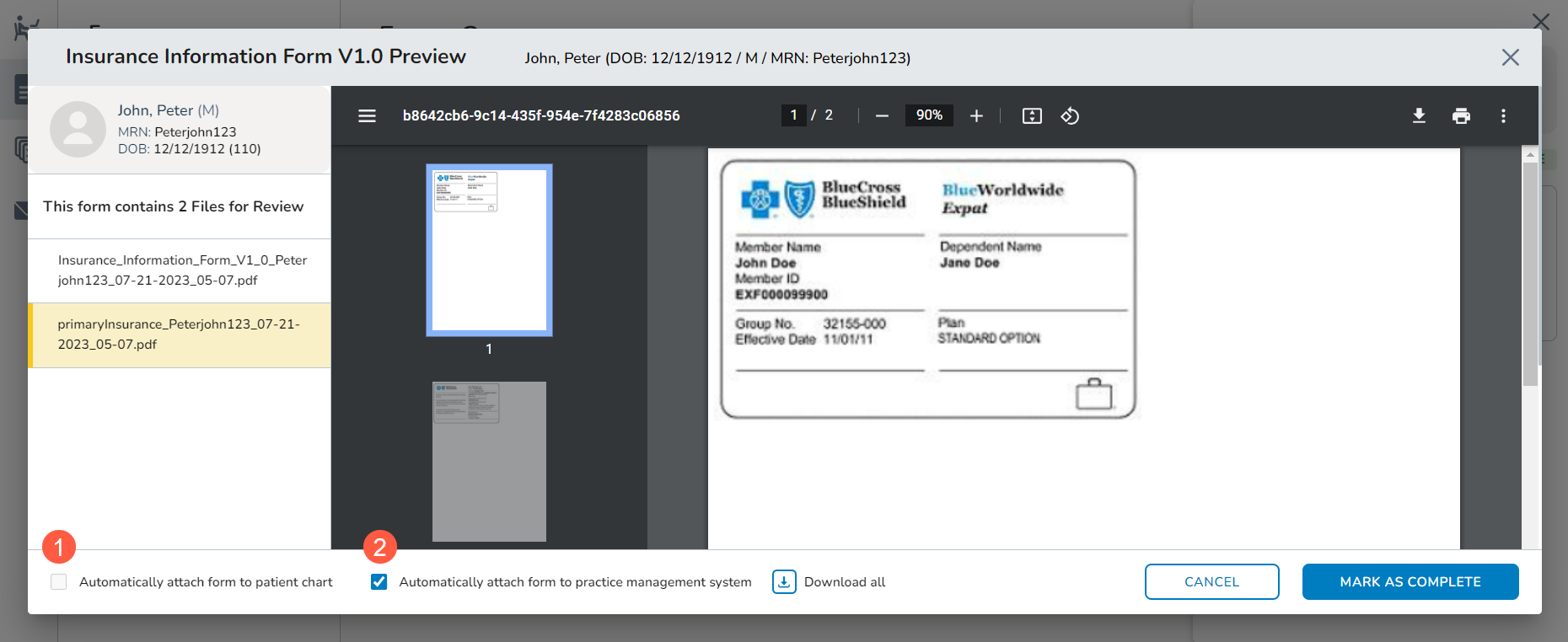 - Send a copy of the form to your practice management system by checking the box next to Automatically attach to practice management system (callout 2).
