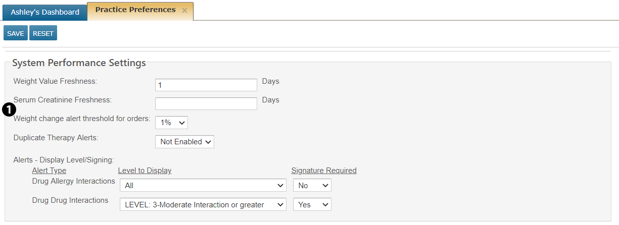 - Under System Performance Settings, change the new Weight change alert threshold for orders to your preferred threshold (see callout 1).