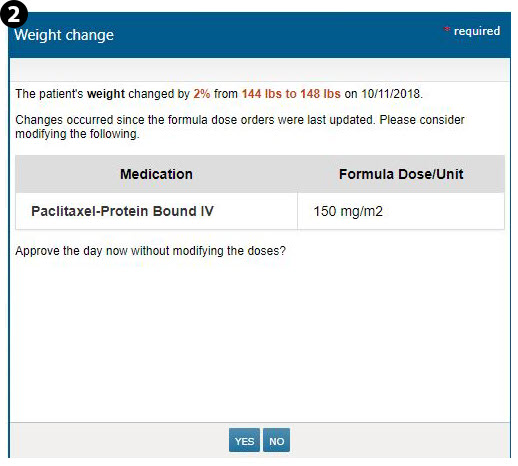 - Now when a patient’s weight changes beyond your preferred threshold, you will receive an alert when approving or editing a regimen that contains at least one order that is weight based in the patient’s Flowsheet (see callouts 2 and 3).