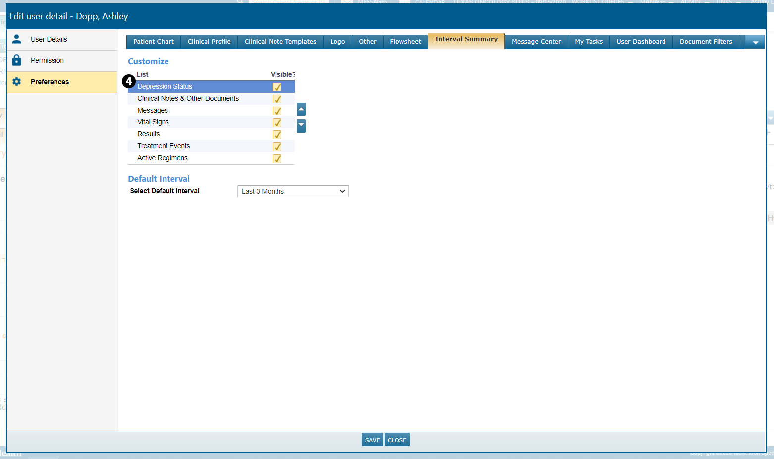 Lastly, you can choose where the Depression Status section displays in the Interval Summary by clicking on the gear icon in the top navigation. Under Preferences > Interval Summary you can choose whether you want this section to appear by checking or unchecking the box under the Visible column. You can also use the blue arrows to move this section above or below others (see callout 4).