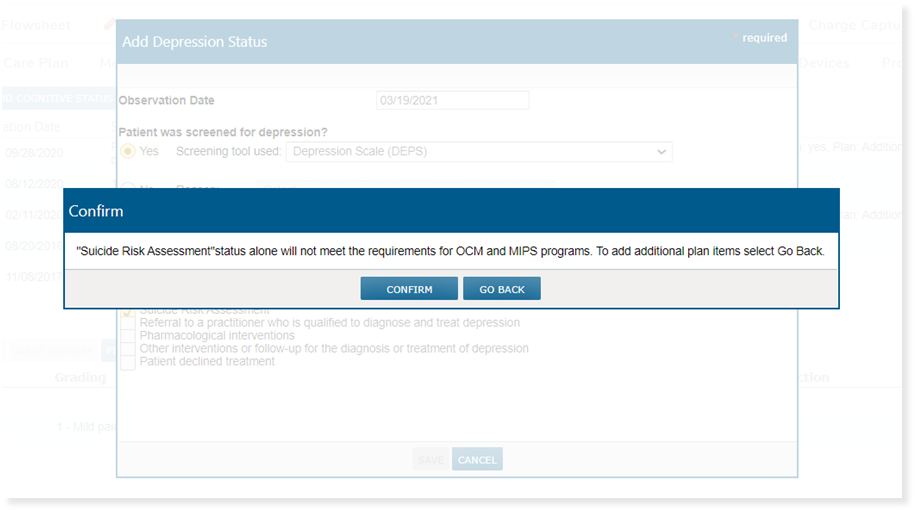 You will also notice that when documenting a patient’s depression status in Clinical Profile > Observations, choosing the Suicide Risk Assessment option and saving your changes results in the appearance of a new confirmation window notifying you that this option alone will not meet CMS requirements for MIPS and OCM programs.