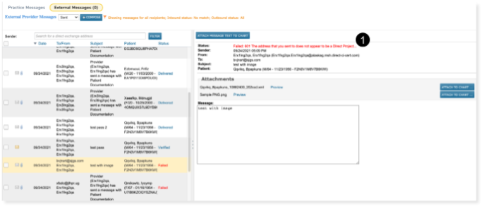 Messages viewed in the External Messages Inbox, Sent, or Archived folders will now display a Status above the sender information. If the message failed, a portion of the error message will display to assist in troubleshooting the issue (see callout 1).