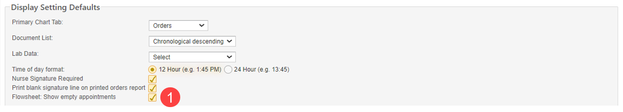 - A new checkbox, Flowsheet: Show empty appointments, has been added to the practice preferences (callout 1).