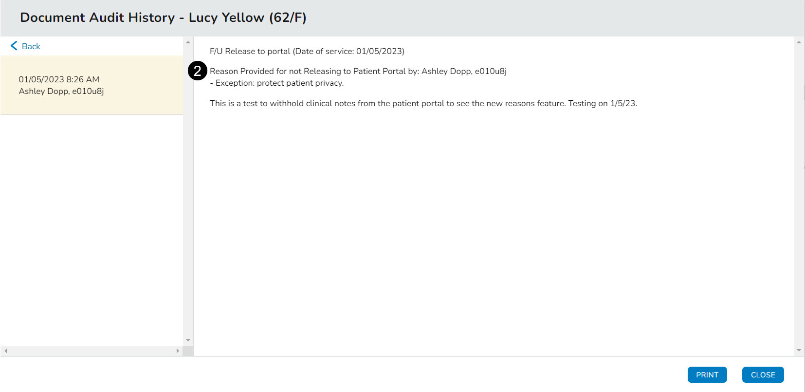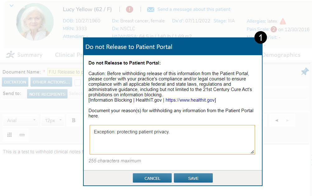 After unchecking the Release to patient portal option on the clinical note, the system requires users to explain why it’s being withheld (callout 1). The pop-up window provides an area with a 255-character limit to type in free text.