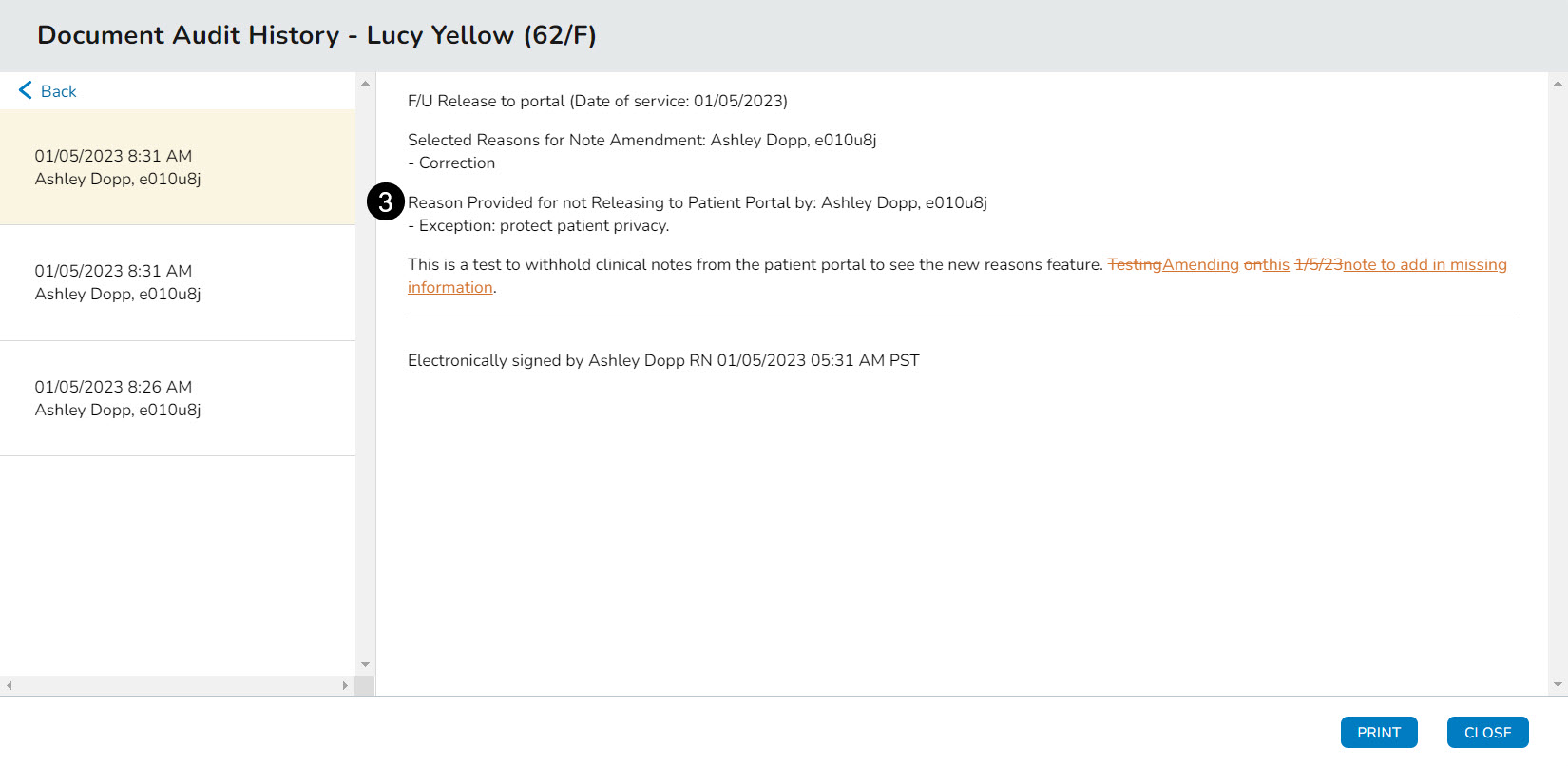 If a user amends the note, this information shows beneath the reasons for note amendment (callout 3).