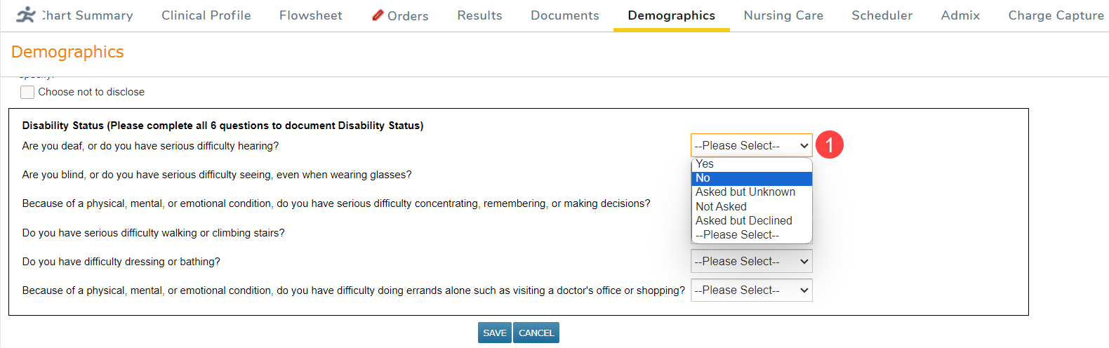 - For each Disability Status question select an answer from the drop-down (callout 1).