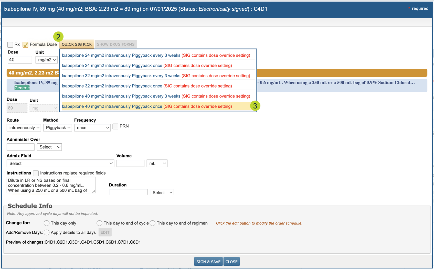 3. In the order editor, click the QUICK SIG PICK button to view available dose options that include the BSA or Weight cap (callout 2).