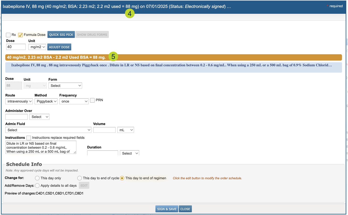 - For patients with a BSA or Weight that exceeds the cap, the calculated dose will be updated, and use of the cap value will display in the order editor (callouts 4-5).