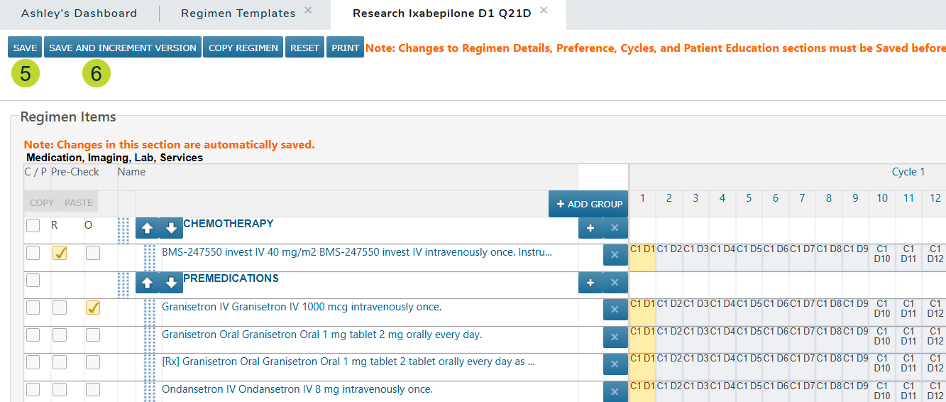 6. When all applicable orders in the template have been updated, click SAVE or SAVE AND INCREMENT VERSION in the regimen template to include configuration with the BSA or Weight cap for new regimen orders (callouts 5-6).