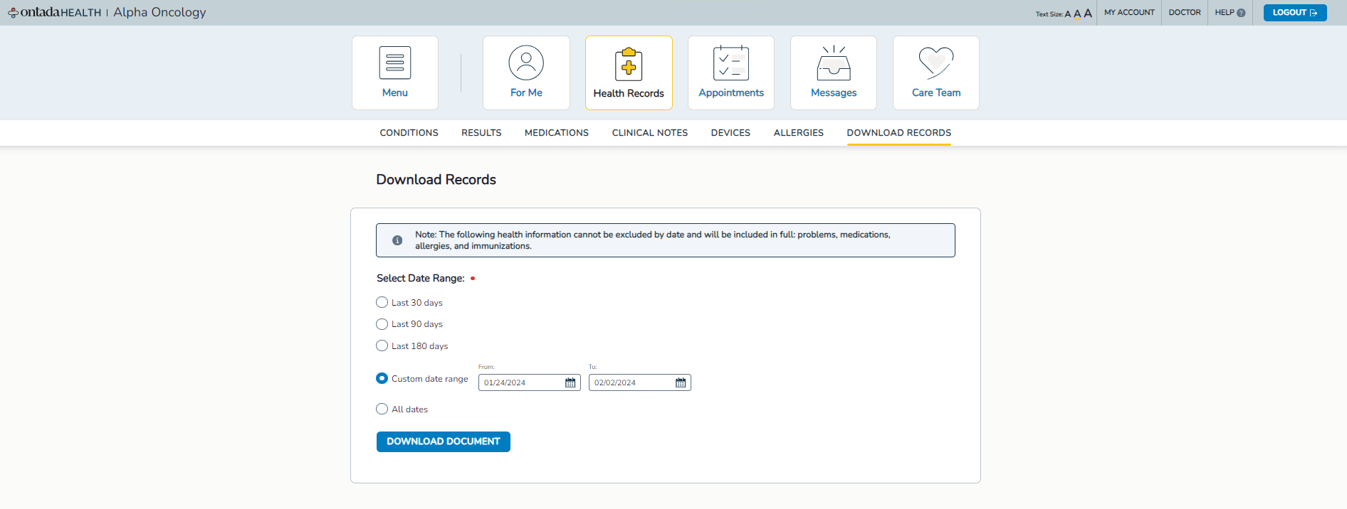 When downloading health records from Ontada Health, patients can apply preset or custom date ranges to filter their results. Available date filter options include:
