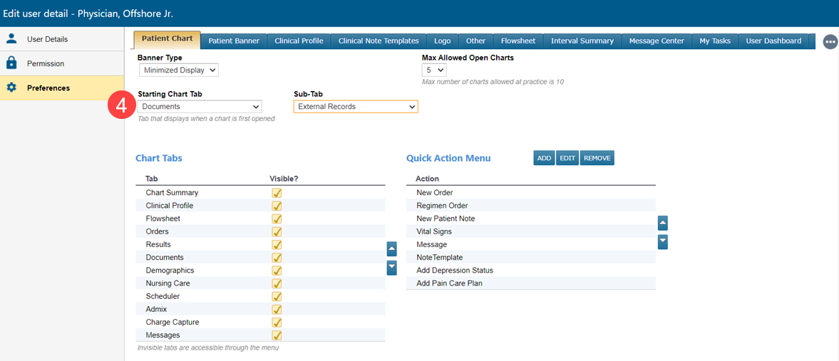 Upon clicking the patient’s name, the chart will open based on your personalized Preferences for the Starting Chart Tab or Subtab (callouts 2-4).