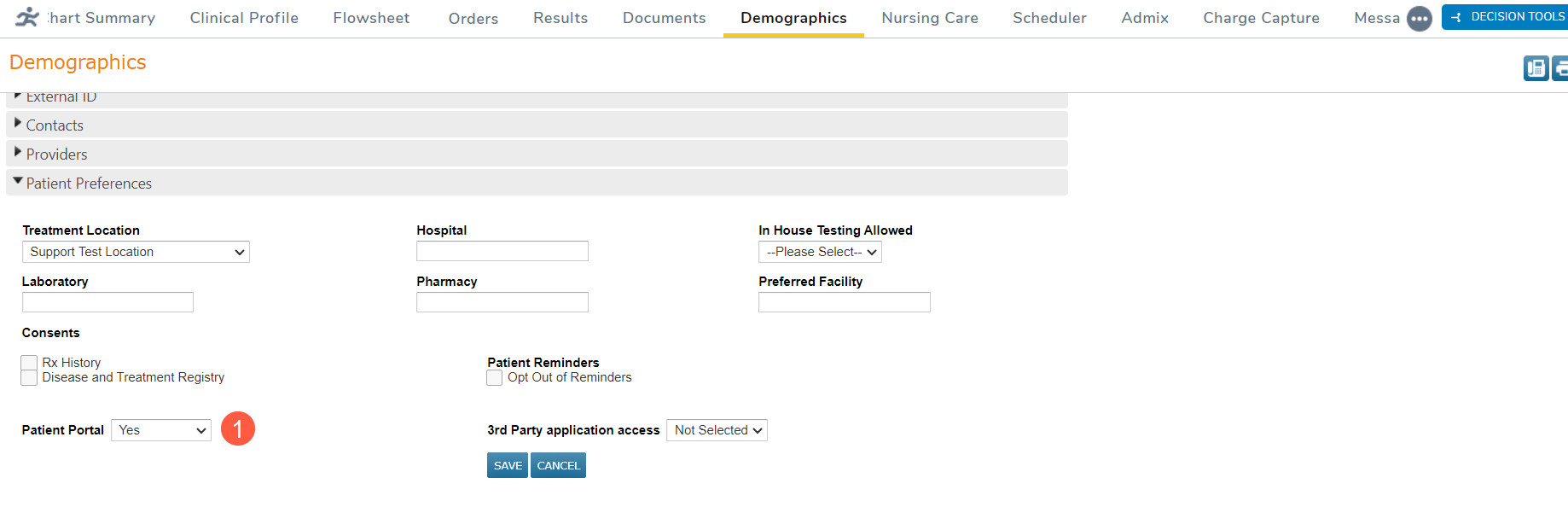 For new patients or patients not currently enrolled in a patient portal, go to the Demographics tab, and change their Patient Portal setting to Yes (callout 1).