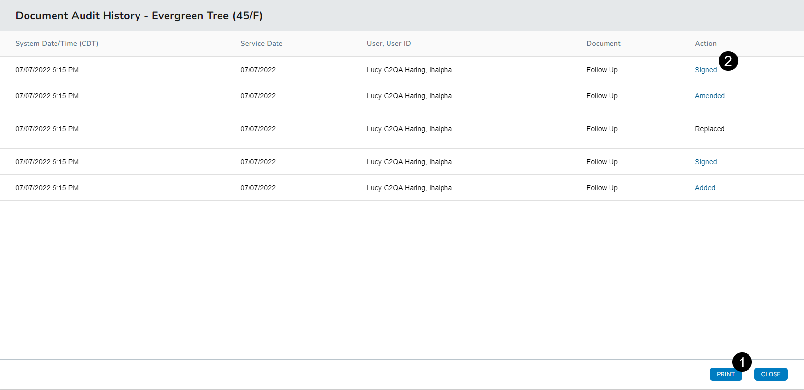 When viewing the Audit History for a clinical note, users will now see a button that allows them to print the history (see callout 1).