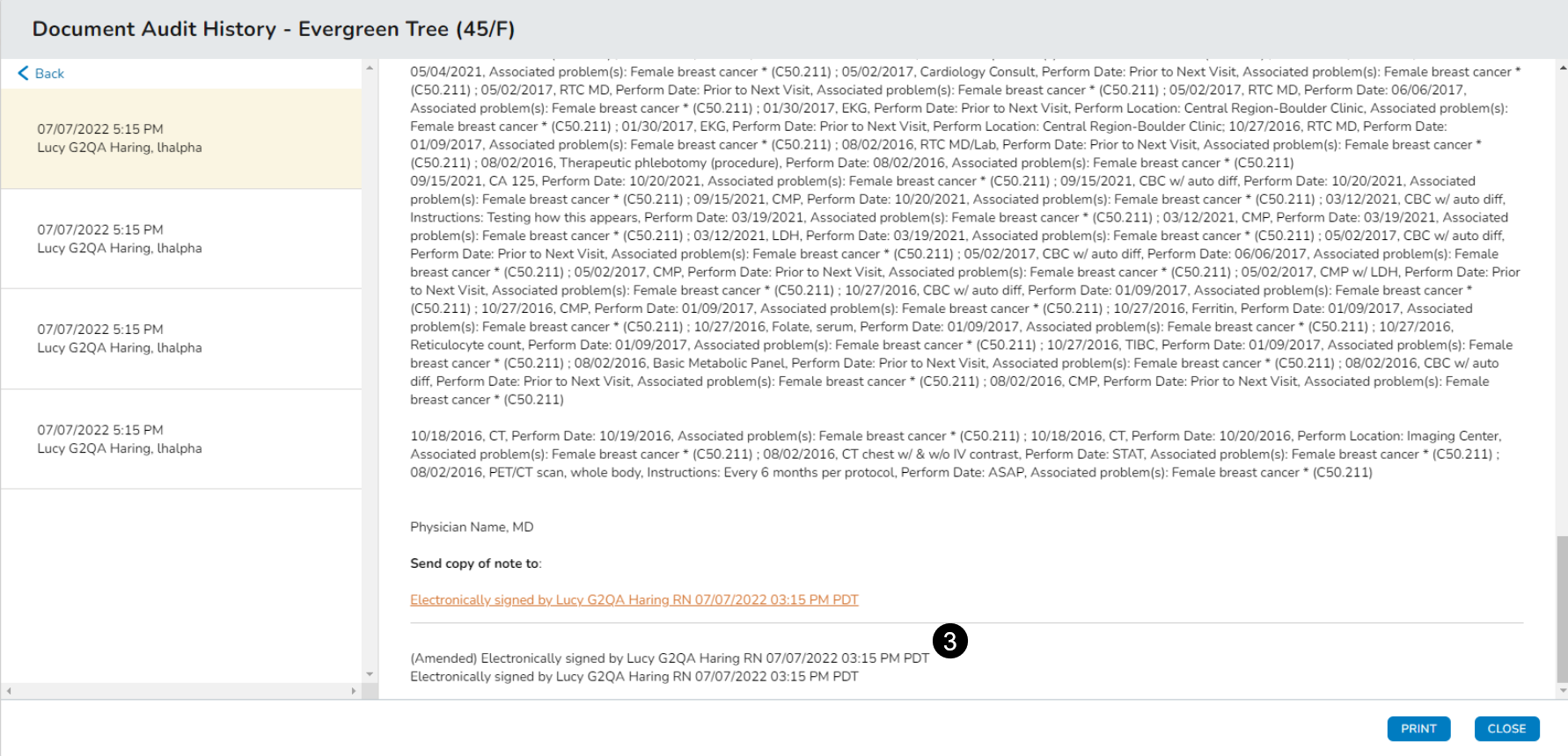 If the note was signed, the recorded history also displays the signee’s first name, last name, credentials, signing date, signing time, and time zone (see callout 3).
