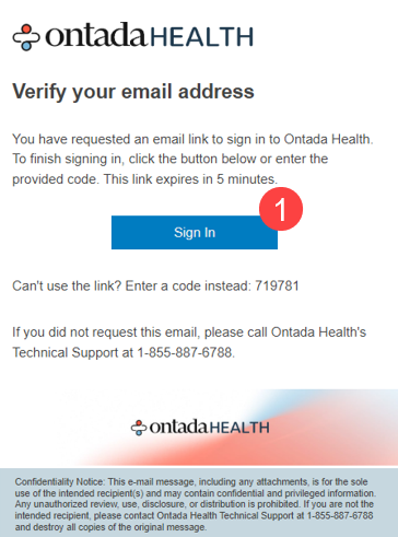 - They can confirm their identity by clicking the Sign In button (callout 1) in the email, or manually entering the verification code on the portal screen (callout 2).
