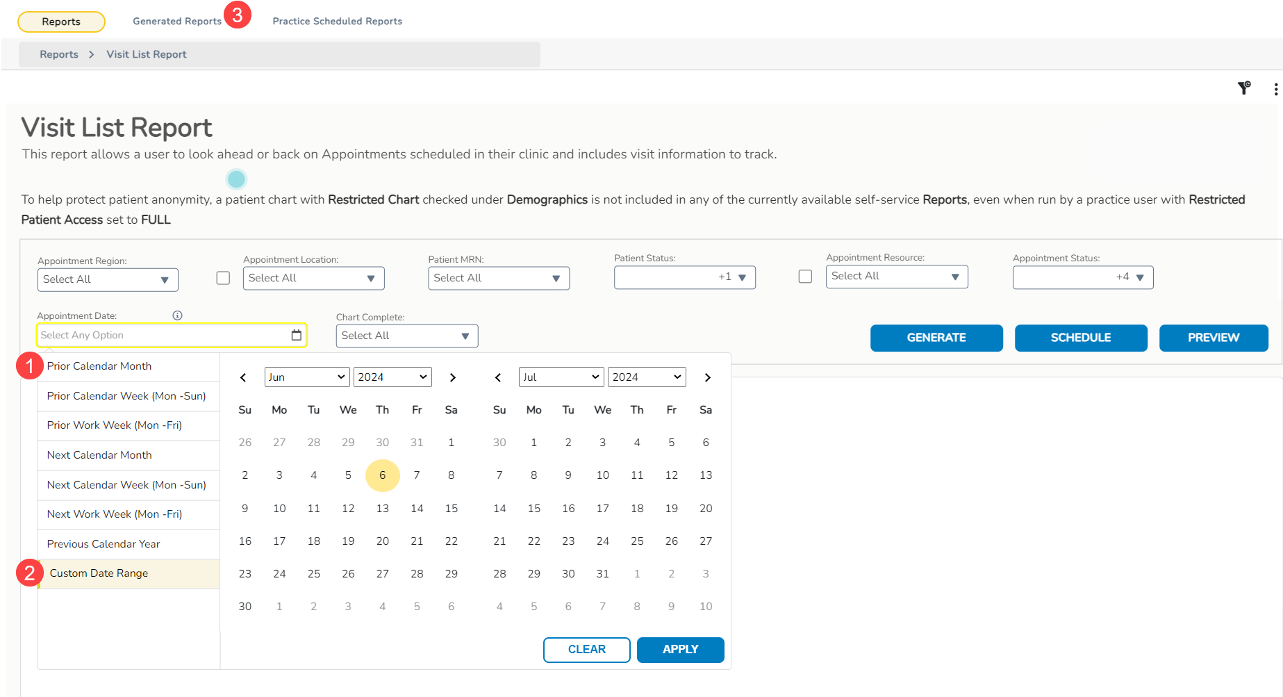 - Quick Date Ranges: Users can now select from predefined date ranges for more efficient report generation (see callout 1 for example). This includes options such as, “Last Week,” “Next Month,” etc.