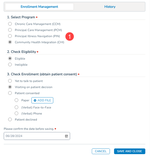 - When “Yes” is selected, the patient will be enrolled, and the enrolled icon will appear in the patient banner.