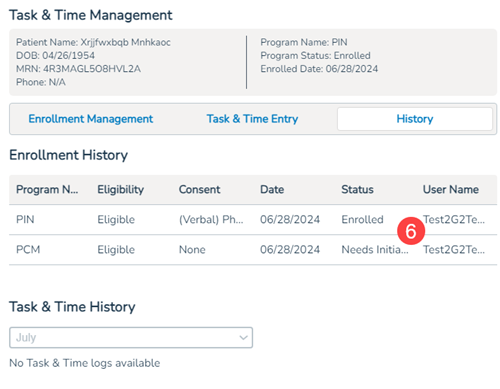 - The History section of the feature and the Task & Time Report will also be updated to include the initiation visit statuses, helping track all changes made to tasks and times for each patient (callouts 6 and 7).