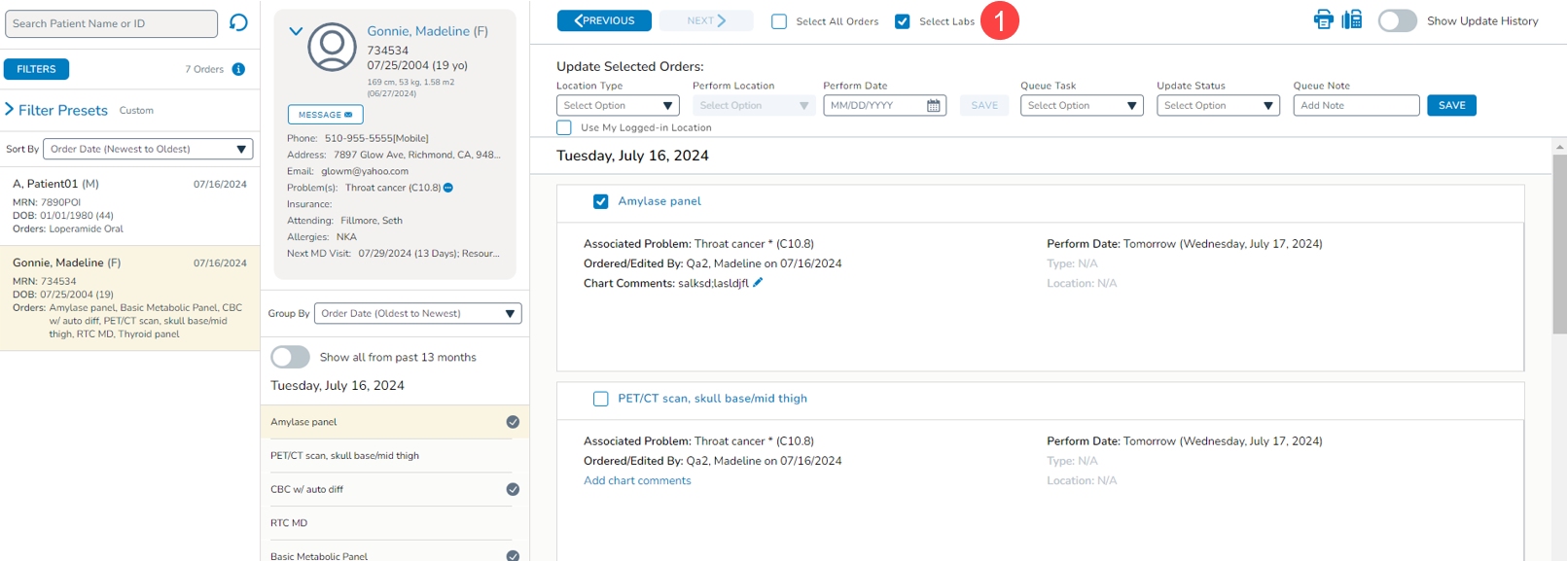 A new Select Labs option has been added, allowing users to act on all lab orders for a patient simultaneously, simplifying the process (callout 1).
