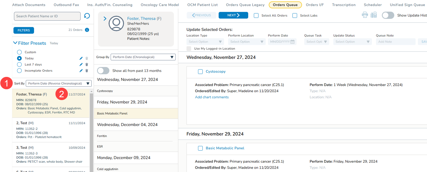 In the Orders Worklist, when sorting by Perform Date (Reverse Chronological) or Perform Date (Chronological), the date displayed on the patient card is the earliest perform date for the batch of orders for that patient (callouts 1 and 2).