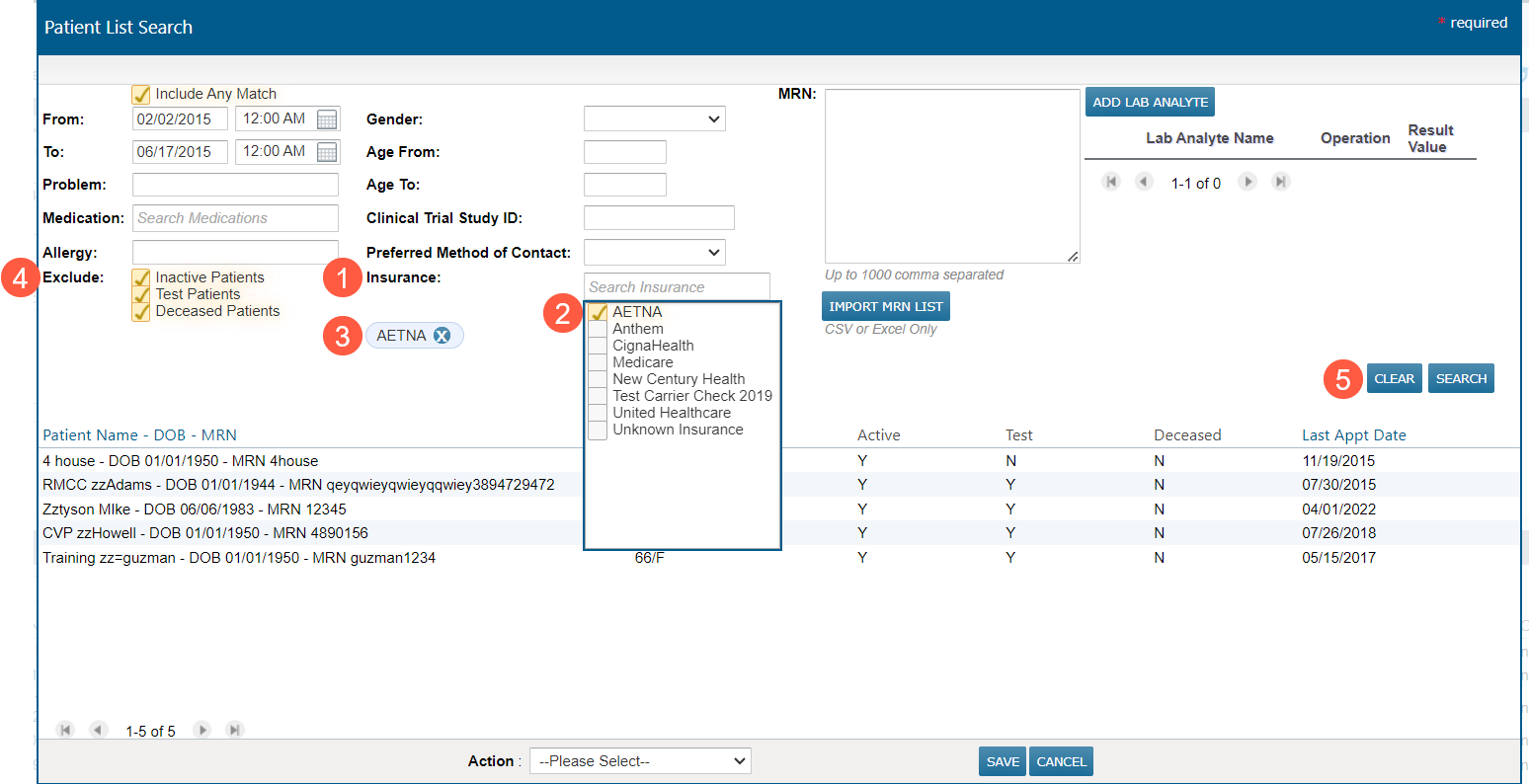 In addition to the new insurance filter, the screen has had subtle adjustments to group criteria and buttons together. The exclude search criteria have been grouped under Exclude (callout 4), and the Clear and Search buttons have been moved (callout 5).