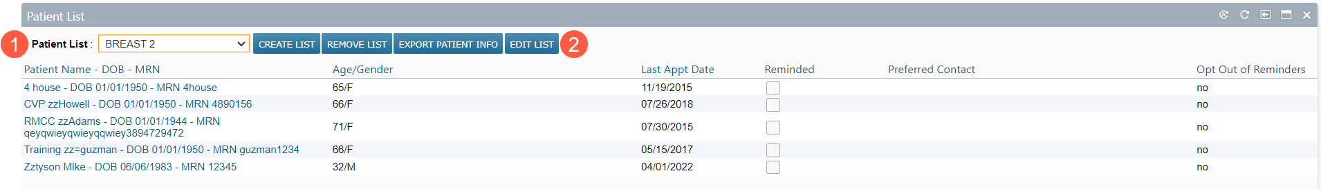 - Go to the patient list widget and select the Patient List you want to edit (callout 1).