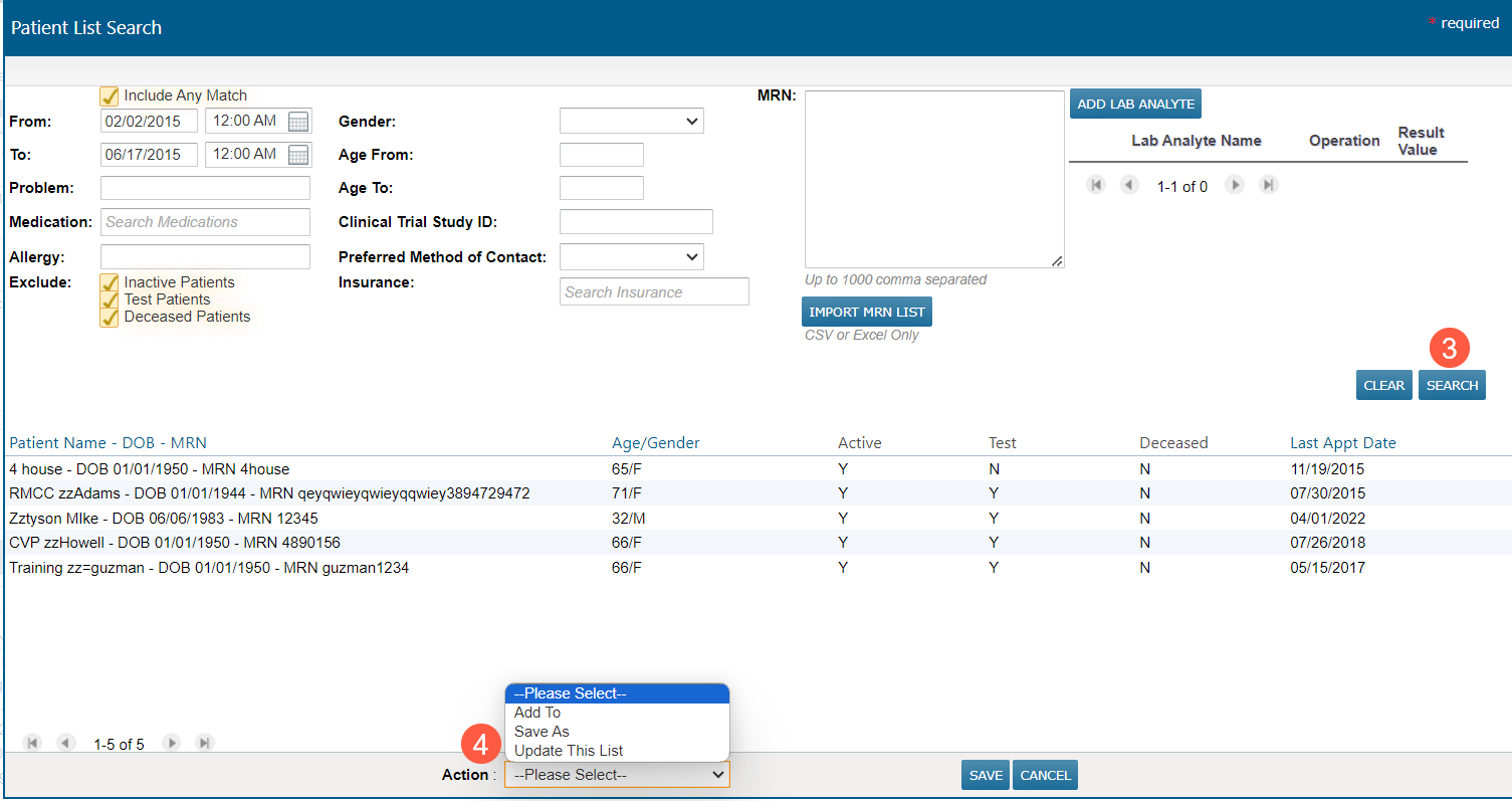 - Keep the existing search criteria and click Search (callout 3) again to generate an updated list of patients who fit the existing criteria, or you change the search filters and click Search (callout 3) to change the list of patients.