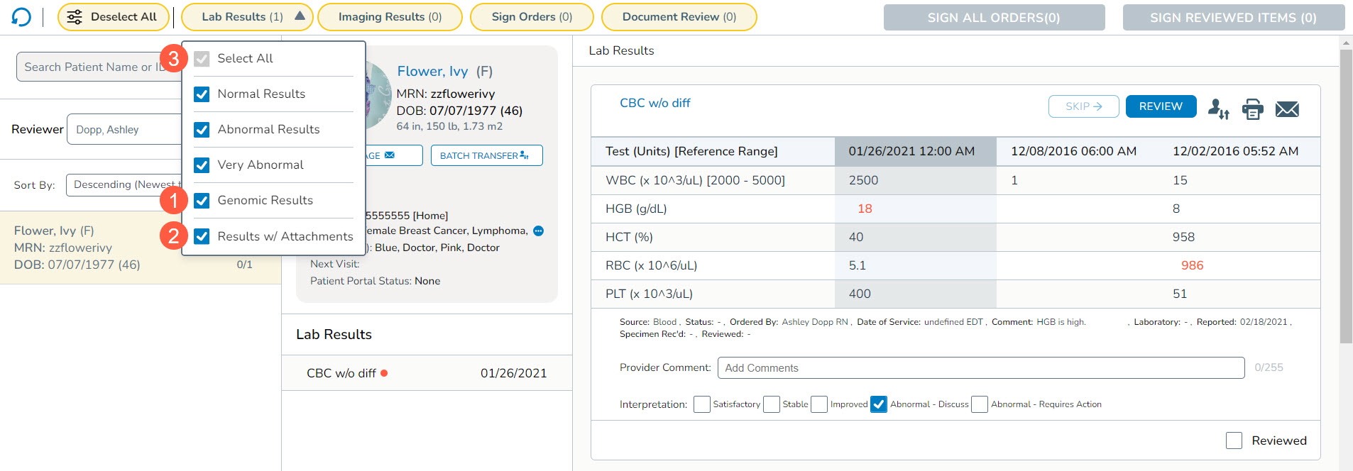 - The Results with Attachments filter is designed to display only patients with results that include attached documents, excluding genomics) (callout 2). This can be useful for reviewing lab results accompanied by additional documentation.