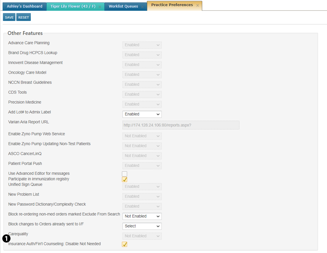 Under Other Features, turn on the new Ins. Auth/Fin. Counseling: Disable Not Needed option (see callout 1).
