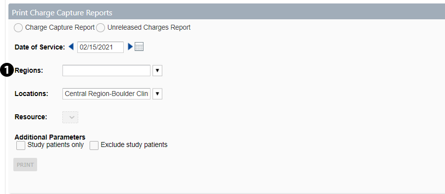 Practices can now filter the charge capture report by region using a new Regions option in the charge capture report and unreleased charges widget (see callout 1). All regions associated with your practice will display, allowing you to view charges associated a single region or multiple regions.