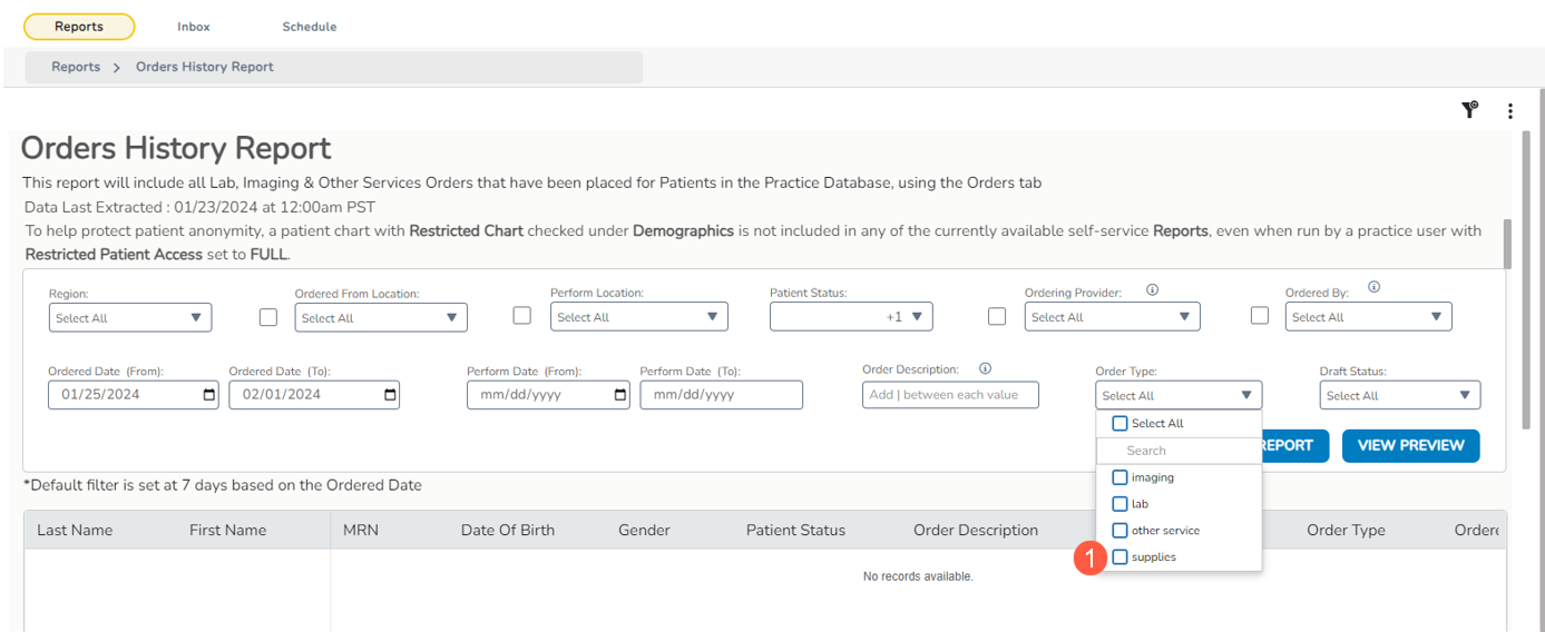 The Order History Report now includes supplies as an option in the Order Type filter, allowing users to include or exclude supplies from the report for a complete view of all ordered Labs, Imaging, and Other Services (callout 1). This update can help practices precisely analyze and manage their order history with increased accuracy and efficiency.