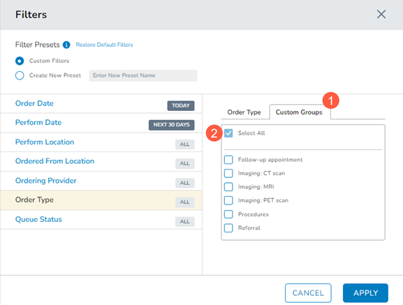 Filters in the new Orders Queue have been updated to move the Advanced Filters option to the Order Type section with the new name of Custom Groups (callout 1).