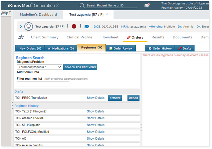 We enhanced the Regimens logic so that search results will be limited to the regimens available at your logged-in location and that meet the diagnosis and other filter criteria.