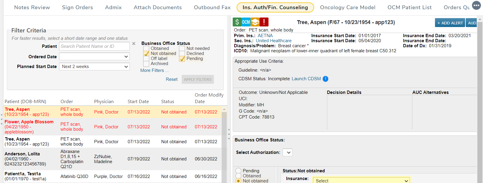 STAT or ASAP orders now appear in the Ins.Auth/Fin. Counseling worklist in red font. These orders will appear first in the list by default. If you change the default sorting, the STAT and ASAP orders will remain in red font but the orders will still sort according to your selection.