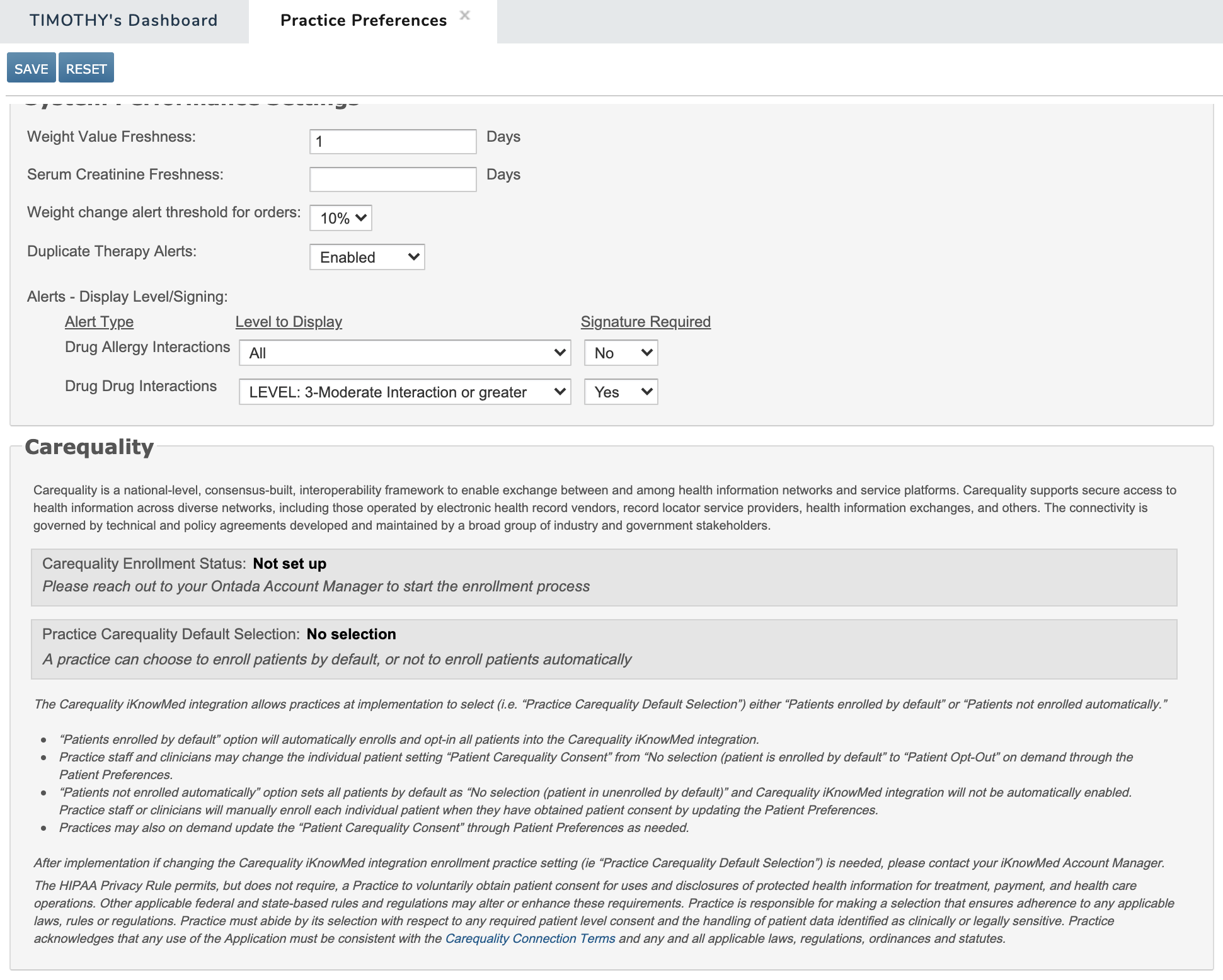 Please note that these Carequality preferences cannot be changed by your practice at this time. This is a work-in-progress, and communication will be sent when the functionality is available for general use.