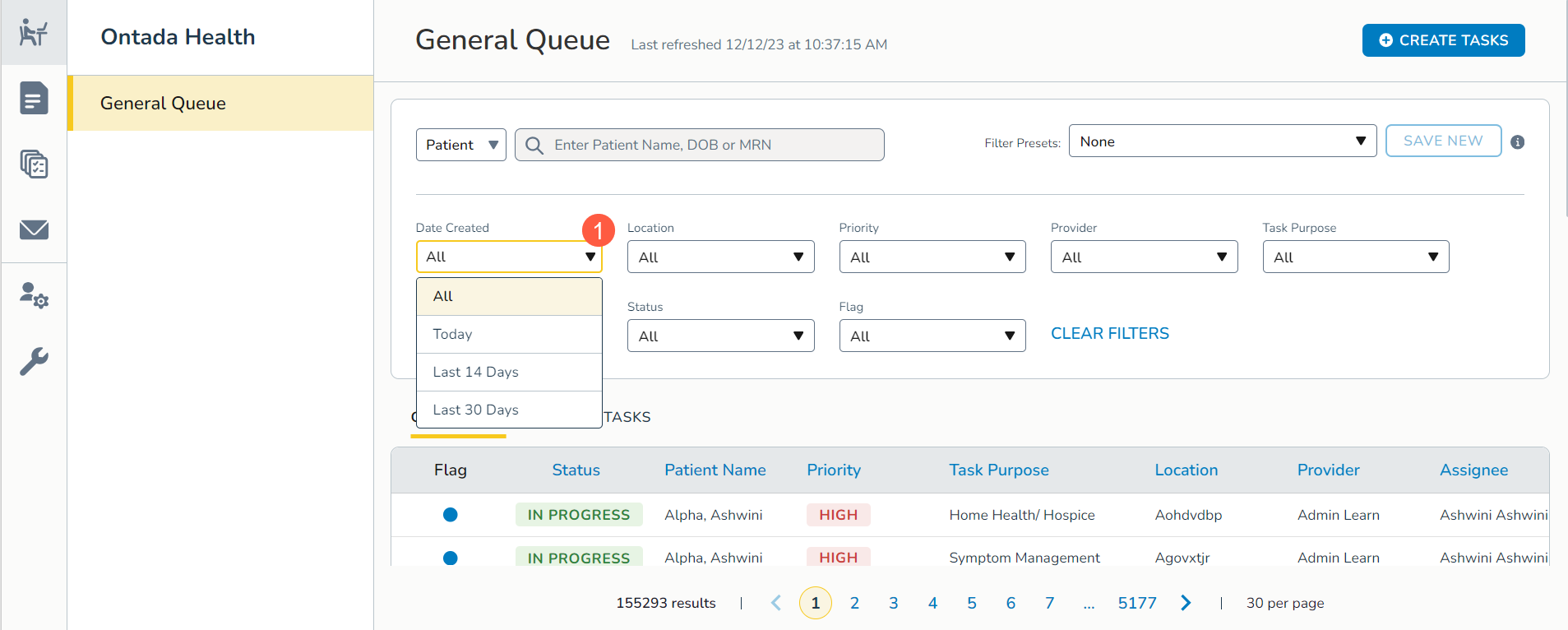 Optimize your search with updated options for the Date Created filter, including All, Today, Last 14 days, or Last 30 days for both open and closed tasks (callout 1).