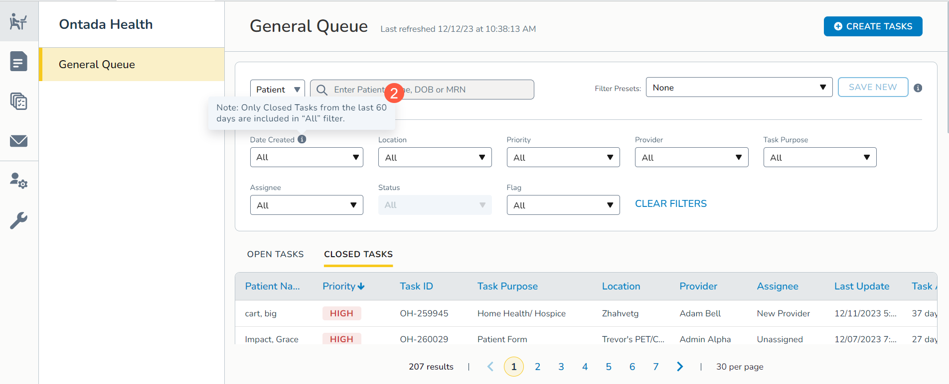 An informative “i” icon provides details for enhanced understanding that for closed tasks, the All filter will only include information from the last 60 days (callout 2).