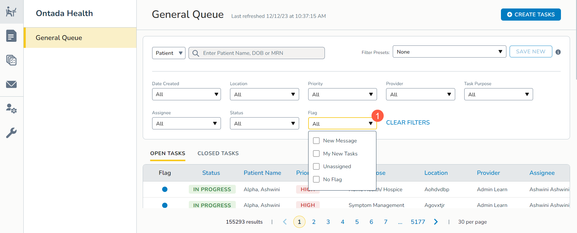 - New Message: Stay on top of patient interactions by viewing tasks with new patient or caregiver messages as indicated by an envelope icon.