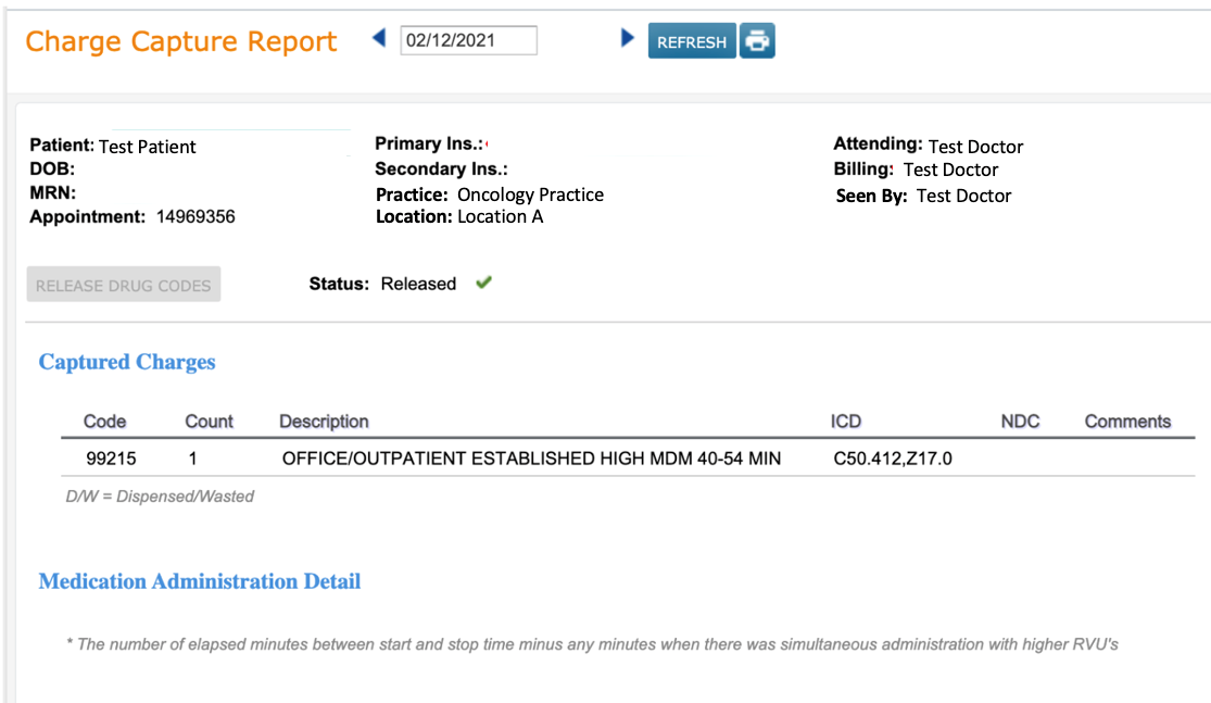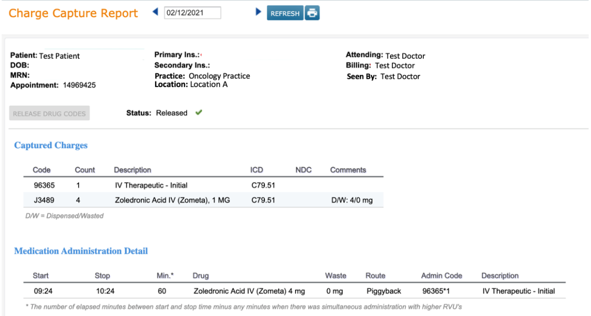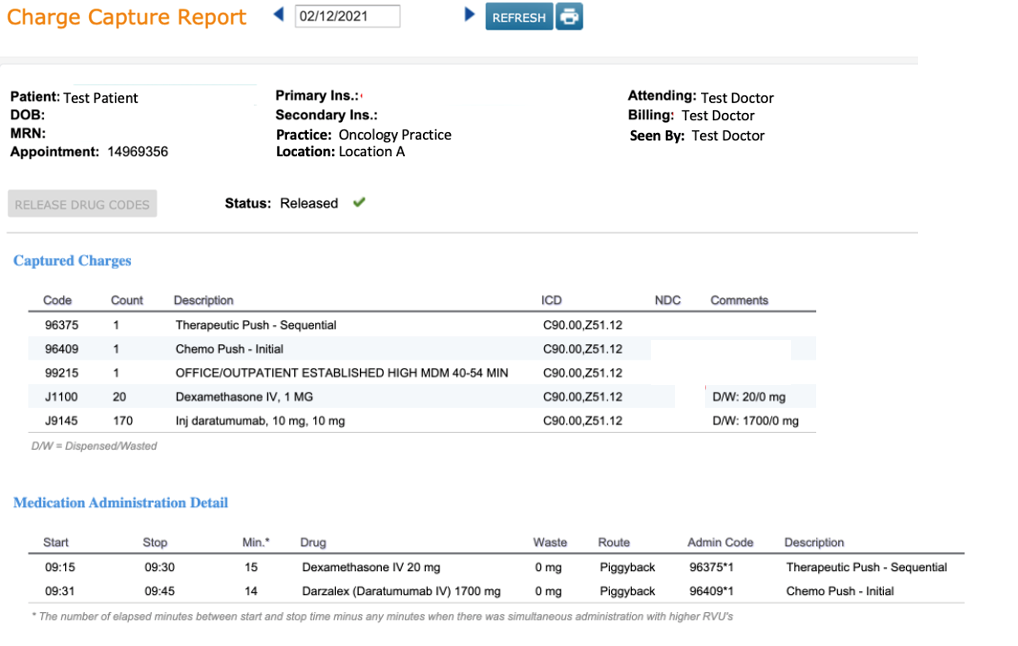 See example below of an E/M appointment and an infusion appointment bundled on the same Charge Capture Report when the Practice Preference is turned off.