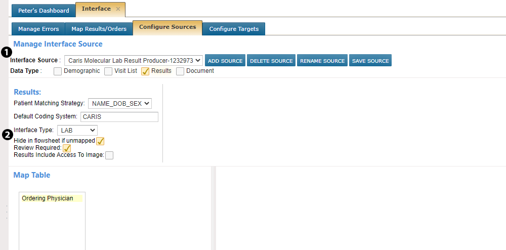 To hide unmapped results, go to ADMIN > Interface. Under Configure Sources, choose your interface using the Interface Source dropdown (see callout 1). Under the Results section, check the box next to Hide in flowsheet if unmapped (see callout 2). This should only be used for genetics labs interfaces.