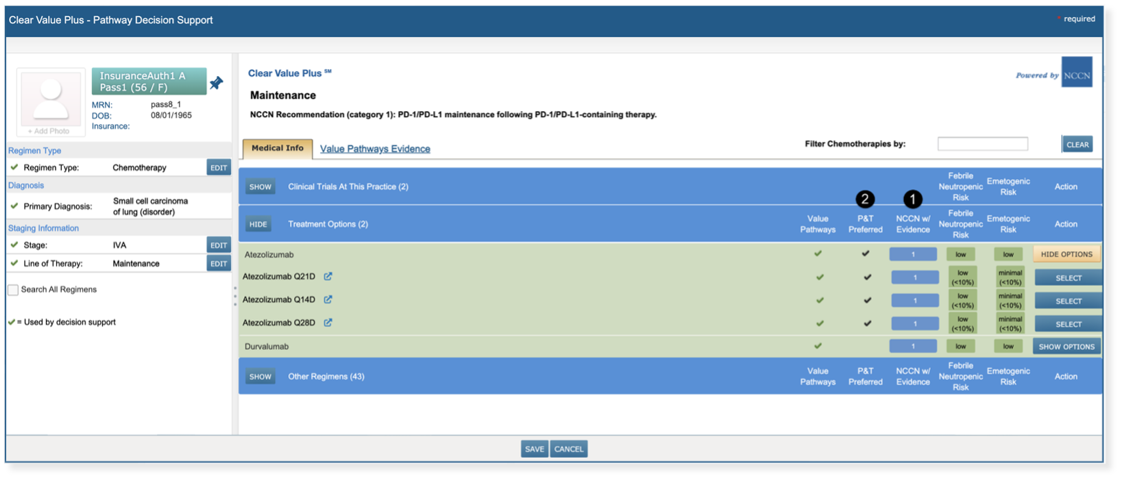 Quickly identify NCCN category of evidence levels for regimens in Clear Value Plus. For NCCN regimens, the category of evidence will now display in the NCCN w/ Evidence column (see callout 1).