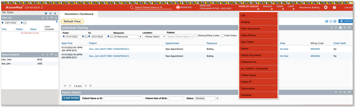 The iKnowMed Generation 2 Read Only environment allows you to view charts and other patient data when the production environment is not available, enabling you to continue engaging with patients until the system is restored.
