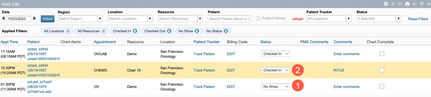 - No Show Status Integration: iKnowMed now seamlessly integrates with your PMS to accept and display a No Show status in the Visit List (callout 1). This means that iKnowMed will no longer automatically cancel appointments when a patient is marked as a No Show, allowing you to retain the appointment information and making it easier to reschedule or take appropriate action without any data loss.