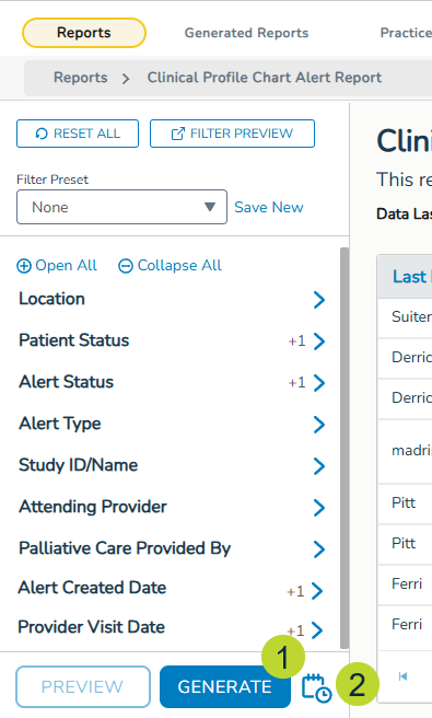 To make it clearer how filters impact your reports, the Generate and Schedule buttons will be relocated next to the Preview button, under the filter area (callouts 1-2).