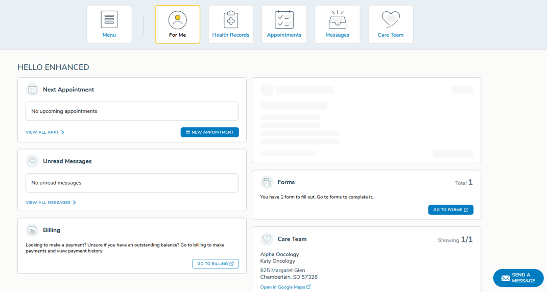 The patient portal now uses a more refined loading experience depending on what’s being loaded. Full-page loads in Forms will continue to show the existing loading animation. However, individual widgets and tables will now display a gray gradient animation that mirrors the shape of the content while data is being fetched.