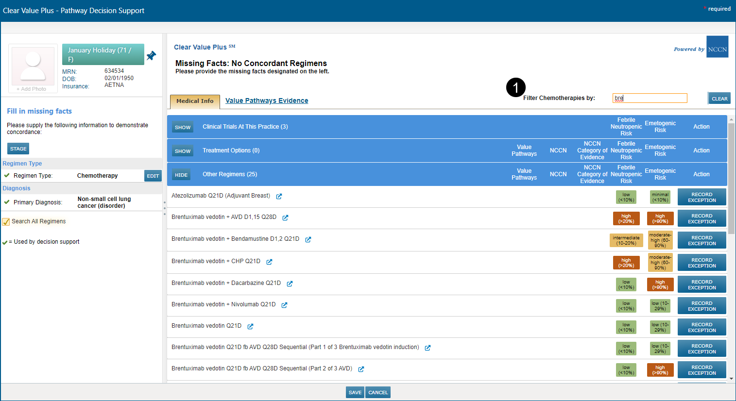 When ordering a regimen for a patient, search results now return faster when the user types criteria into the Filter Chemotherapies by search box (see callout 1). The search initiates immediately, therefore the Apply button has been removed.