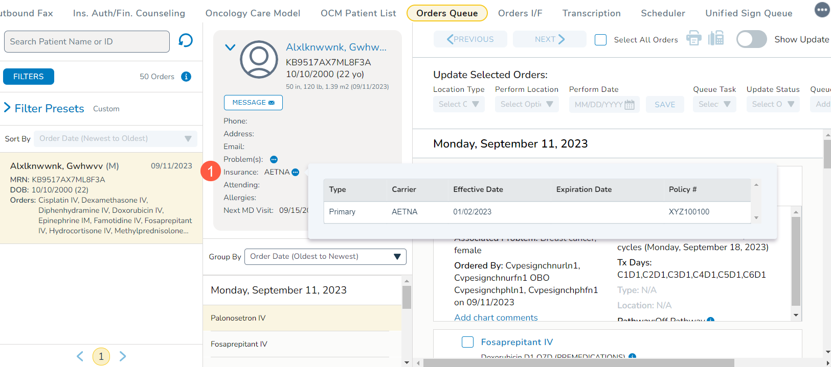 The patient card in each order has been updated to provide a clearer view of patient insurance information. Now, only active and unexpired insurers will be displayed in the Insurance field (callout 1). This improvement helps you focus on the most relevant patient insurance details.