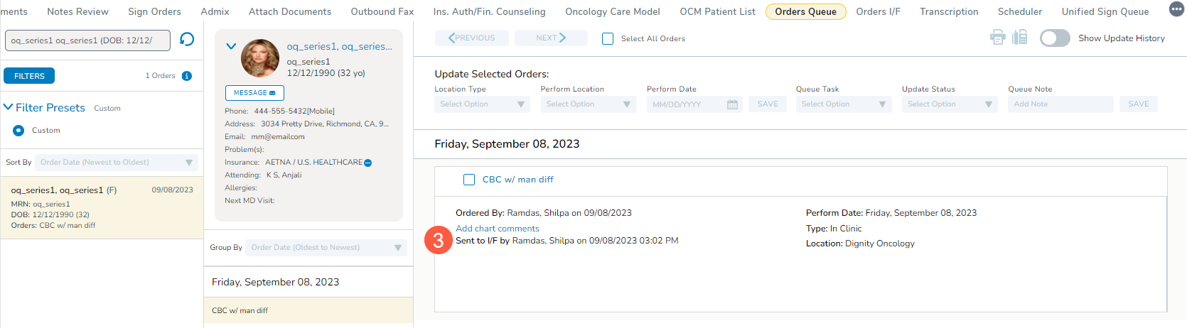 We improved visibility by displaying who sent the order to the Orders I/F queue and when directly on the order card in the enhanced Orders Queue. The Sent to I/F by field (callout 3) aids schedulers and other users of the queue in making informed decisions regarding the handling of each order.